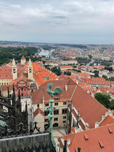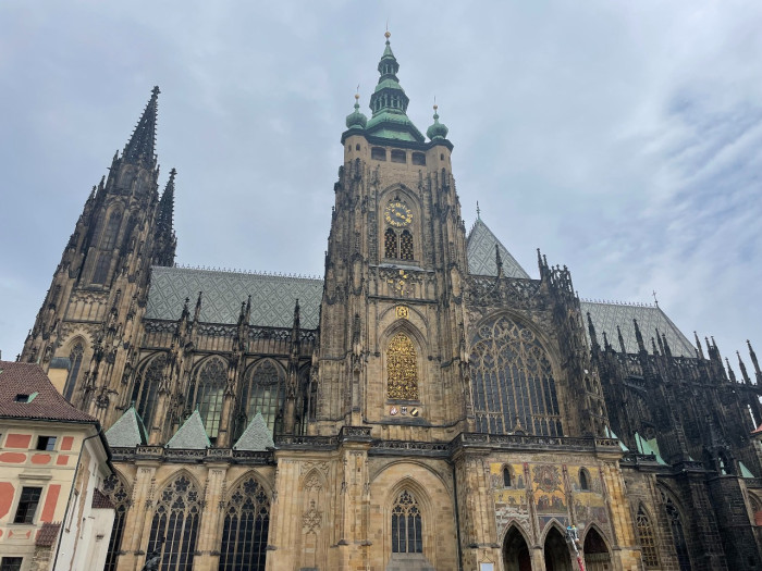 Mi a képen látható toronyba mentünk fel, ehhez a X-es számú jegyet kellett megvenni. Ez ez épület a Szent Vitus-székesegyház, Csehország legfontosabb temploma, cseh királyok nyughelye.